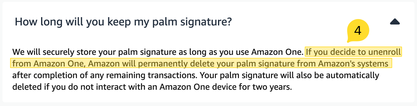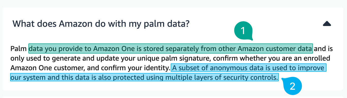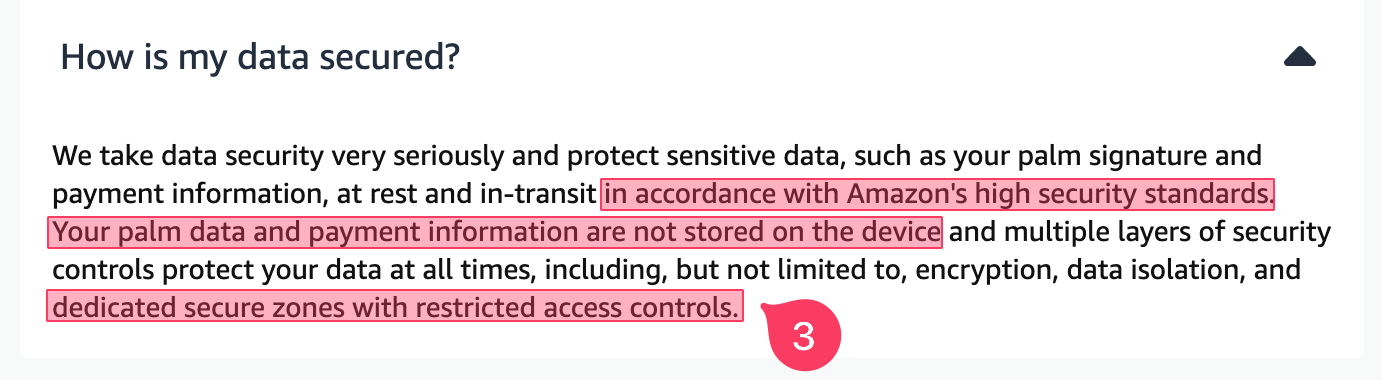 In the first section, Amazon says (#1) that your biometrics will be “stored separately” from your other Amazon data. We also know our biometrics won’t be stored on the palm readers themselves. That’s great but WHERE will they be stored? Presumably in the cloud which is comprised of servers in a data center, but that’s not revealed. Also not detailed is this: